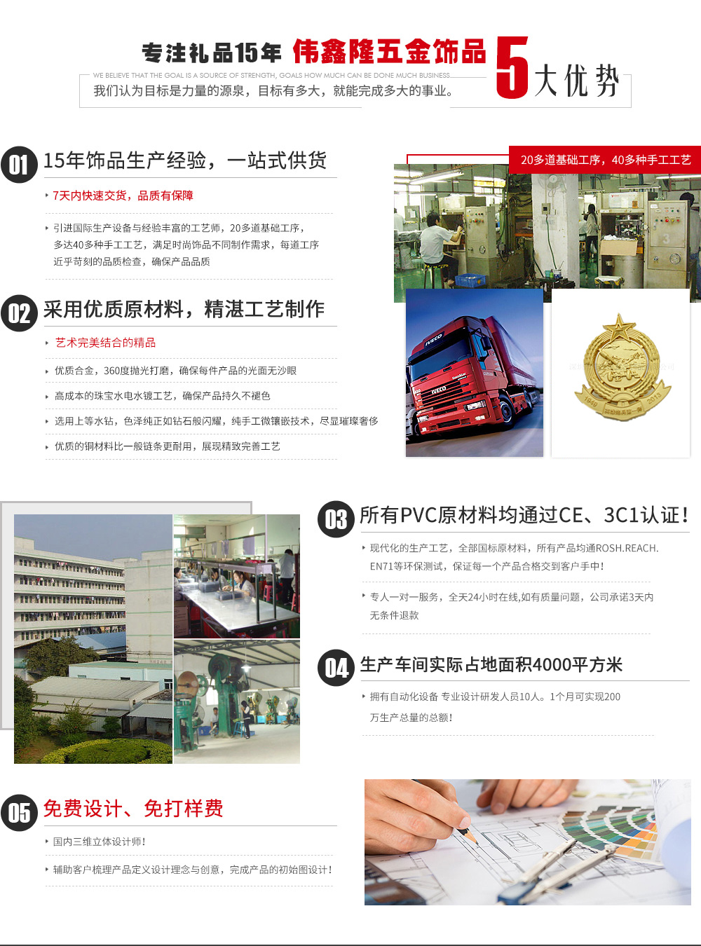 深圳市偉鑫隆五金飾品有限公司位于廣東省深圳市坑梓鎮(zhèn),是一家集設(shè)計(jì)、生產(chǎn)、銷(xiāo)售為一體的專(zhuān)業(yè)五金禮品工藝公司。 公司擁有經(jīng)驗(yàn)豐富的專(zhuān)業(yè)技術(shù)精英團(tuán)隊(duì),至今已有十多年設(shè)計(jì)生產(chǎn)經(jīng)驗(yàn)。 公司自有工廠(chǎng)引進(jìn)先進(jìn)的臺(tái)灣設(shè)備及技術(shù),擁有設(shè)計(jì)、繪圖、制模、沖壓、壓鑄、拋光、電鍍、包裝等生產(chǎn)流程,可生產(chǎn)銅、鐵、不銹鋼、鋁、鋅合金、鉛錫合金等材質(zhì)的金屬徽章、胸針、胸章、獎(jiǎng)?wù)?、?jiǎng)牌、金屬標(biāo)牌、工號(hào)牌、金屬鑰匙扣、狗牌、軍牌、開(kāi)瓶器、金屬手機(jī)吊飾、錢(qián)夾、領(lǐng)帶夾、帽夾、項(xiàng)鏈吊墜、掛包鉤、紀(jì)念章、紀(jì)念幣、袖扣、促銷(xiāo)禮品鑰匙扣、書(shū)簽、五金配件、開(kāi)瓶器等旅游紀(jì)念品及工藝禮品五金飾品。我公司還可根據(jù)客戶(hù)樣板開(kāi)模生產(chǎn)。 公司秉承“精...